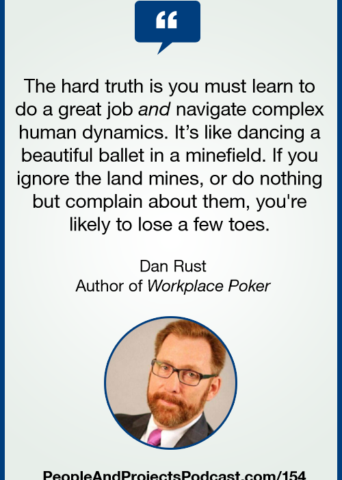 In this episode, I welcome Dan Rust, author of Workplace Poker: Are You Playing the Game or Just Getting Played? If you get sick of office politics, join the crowd. But the reality for project managers is we need to be effective with a wide range of stakeholders, and there are complex human dynamics that must be navigated. This is one of the best books I’ve read on the topic in a while.
